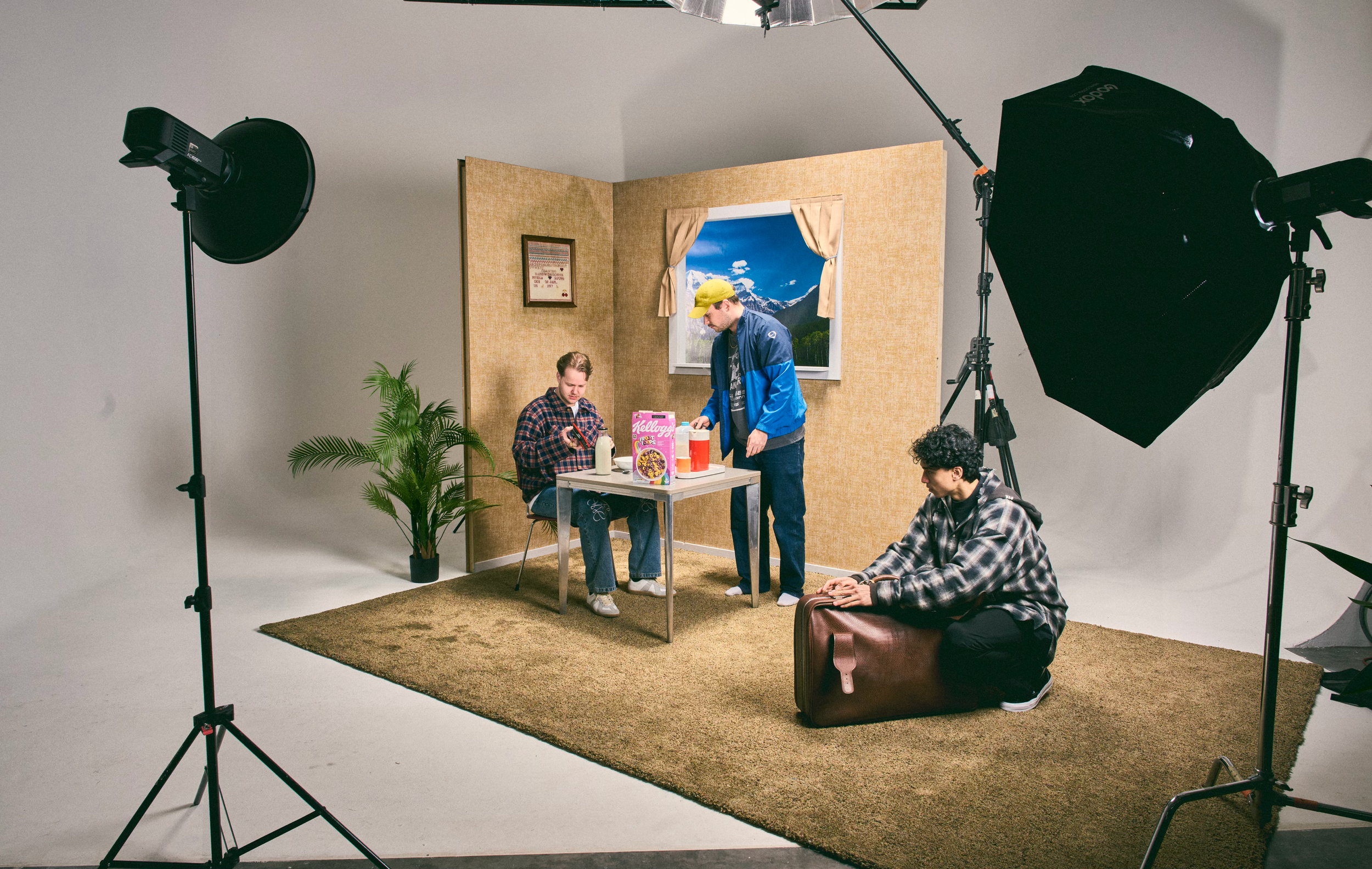 We zijn direct gestart vanuit gevoel en beeld. De inspiratie uit Wes Anderson vertaalden we niet letterlijk, maar naar principes: symmetrie, kleurgebruik, gelaagdheid en een bijna theatrale setting. Het idee was om een set te bouwen die voelt als een scène in plaats van een achtergrond. Iets waar je in stapt, in plaats van voor staat. Vanaf daar ging het snel: Donderdag: brainstorm & concept Vrijdag: start bouw Maandag: afwerking details Dinsdag: props verzamelen Woensdag: opbouw voor de shoot Alles zat op tempo. Geen lange trajecten, maar direct maken.