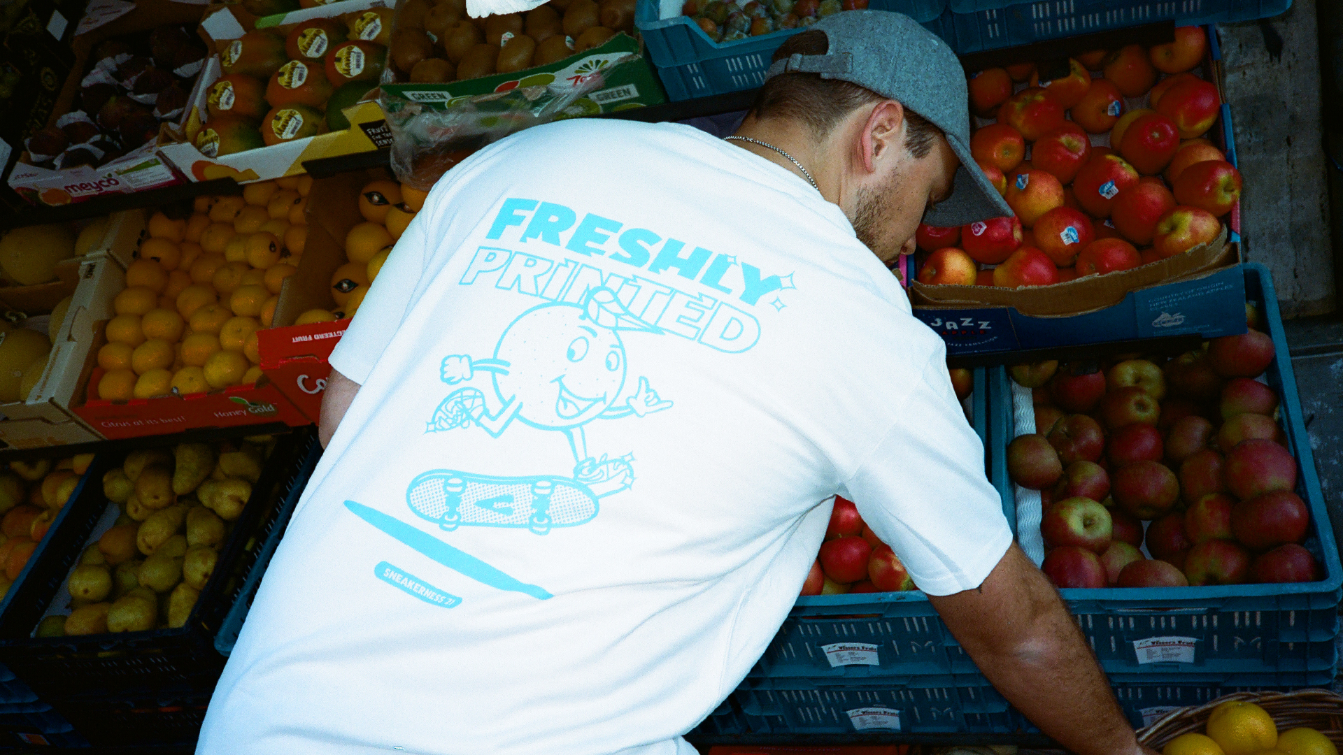 Met deze klassieke fruitstalletjes in gedachten zijn we in 2021 begonnen met het ontwerpen en illustreren van de eerste Sneaker Oranges. Sindsdien drukken we deze illustraties live op het evenement af in onze "Freshly Printed" stand, net zoals sap vers geperst wordt. Voor elke editie creëren we nieuwe Sneaker Oranges die zijn gekoppeld aan de locatie van het evenement. Zo hebben we bijvoorbeeld een "Hypebeast Orange" geïllustreerd voor Amsterdam en een "Gabber Orange" voor Rotterdam. Elk jaar wordt het jaartal toegevoegd aan de T-shirts en veranderen we de kleuren, zodat de T-shirts verzamelobjecten worden die bezoekers bij elke editie kunnen bemachtigen.
